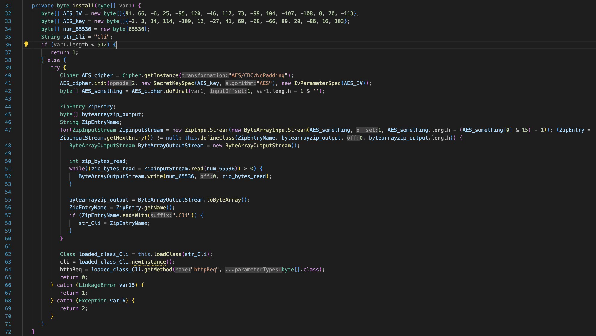 The ‘install’ function, takes a byte array, decrypts it with a hardcoded AES IV and Key and reads the bytes into memory.
