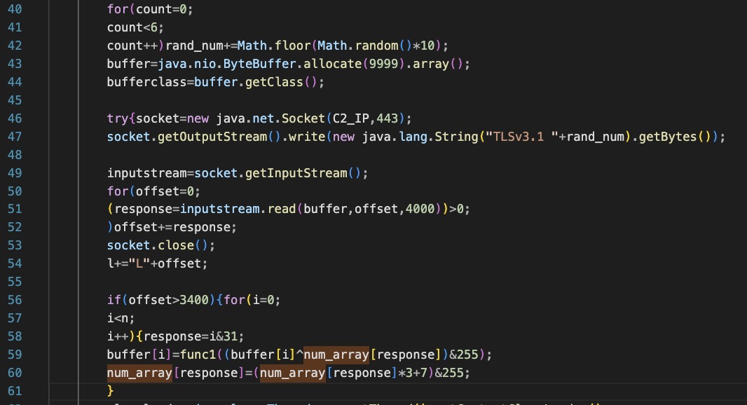 Connects to hardcoded C2 ip with a ‘TLSv3.1’ string, appened with a randomly generated number.