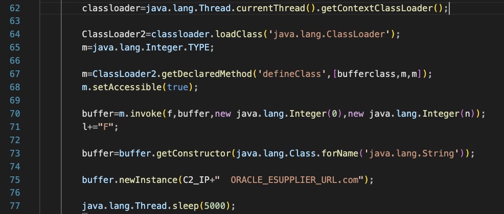 Reads binary data from the C2 into a buffer, decrypts it with a rolling XOR key and then loads it as a Java Class, then invokes it.